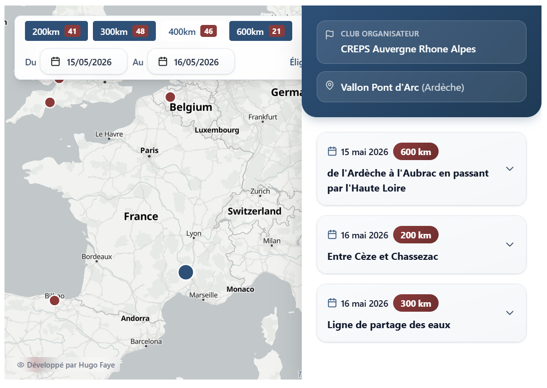 En 2026, pour la 1ère année, le CREPS Auvergne-Rhône-Alpes Vallon Pont d’Arc · Voiron · Lyon est heureux de proposer 3 Brevets Randonneurs Mondiaux (BRM) à Vallon Pont d’Arc, les 15 et 16 mai 2026.